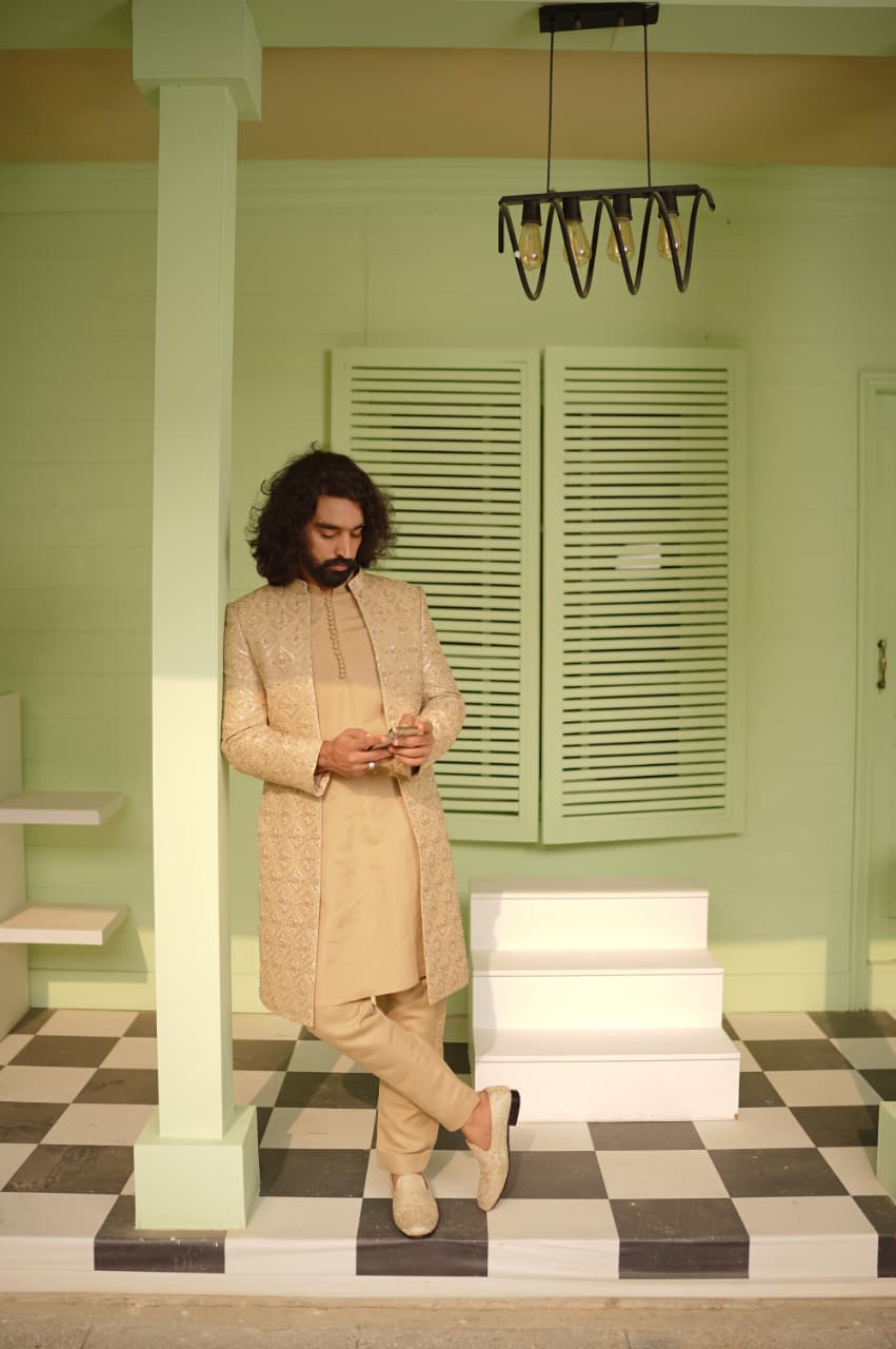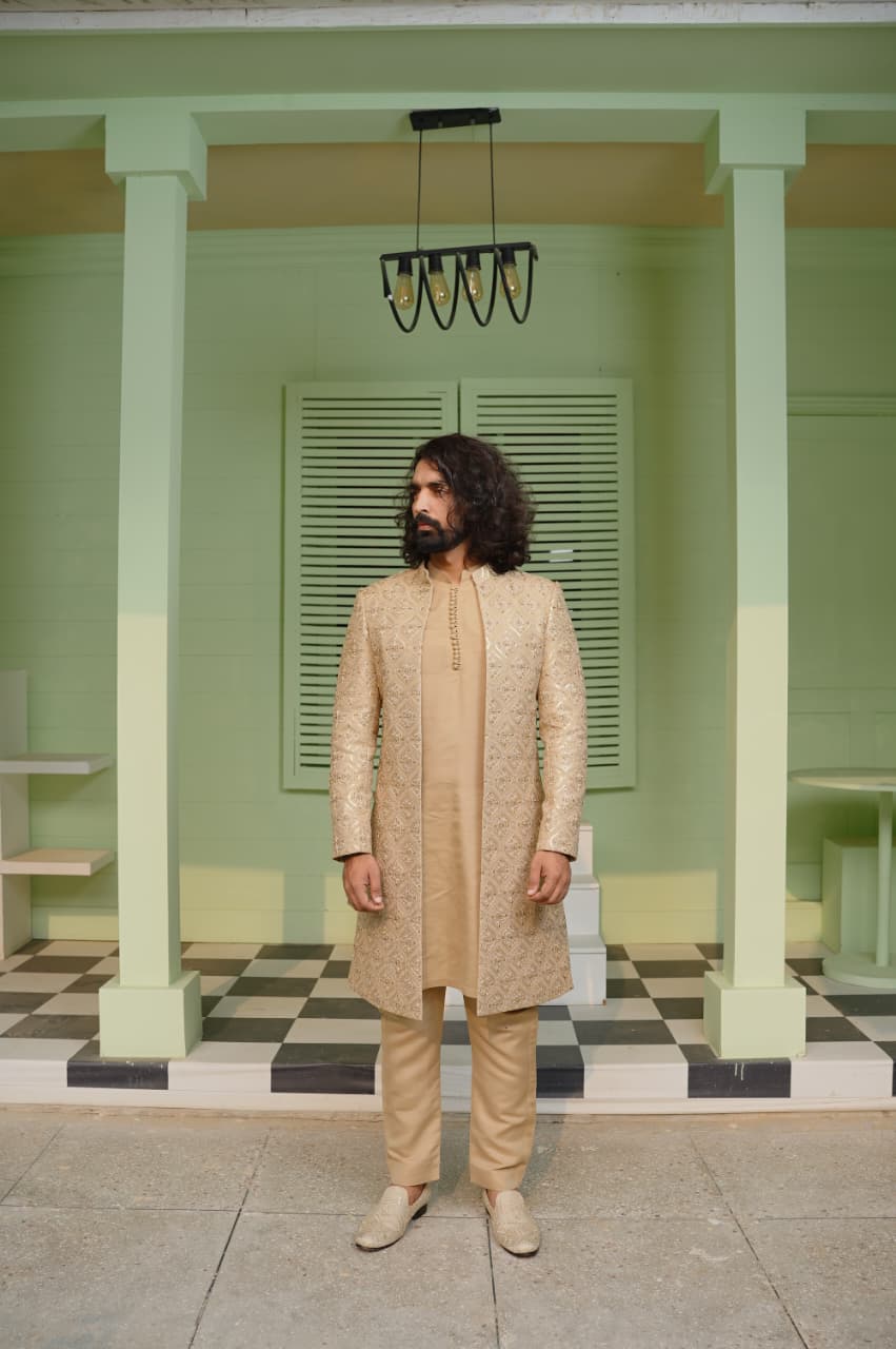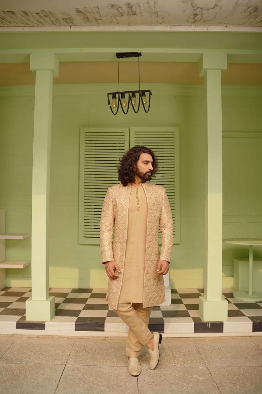 A perfect blend of tradition and modern fashion, this outfit is specially designed for grooms and style-conscious men. The elegant embroidery, premium finishing, and sharp cuts create a regal appearance. Ideal for weddings, receptions, and grand celebrations where you want to stand out with charm and confidence.