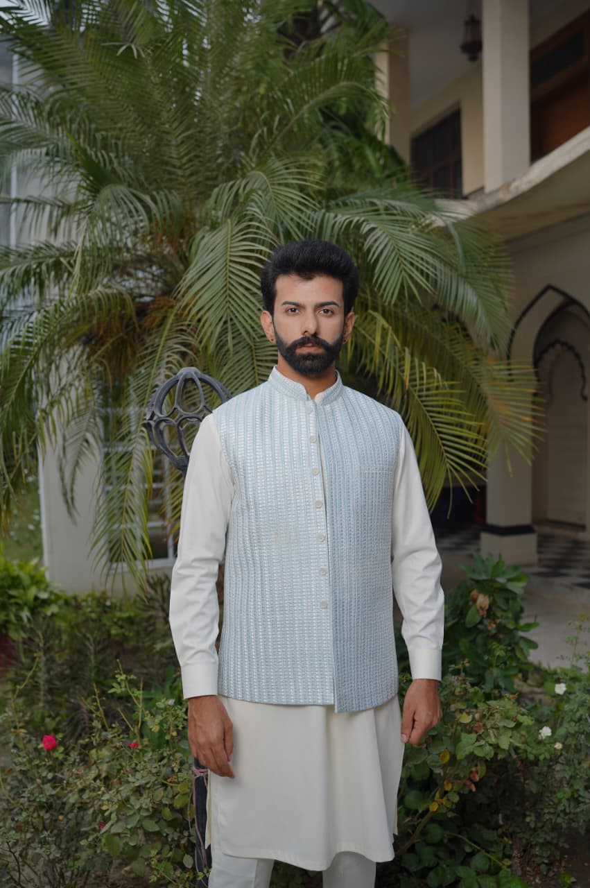 Luxury soft blue colour embroidered waistcoat,Ideal for daytime weddings, festive events, or formal gatherings, this waistcoat brings a modern twist to traditional wear. The soothing color pairs effortlessly with neutral or pastel kurtas, making it a versatile addition to your wardrobe.